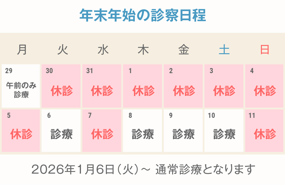 夏年末年始の診察日程は以下の通りです。ご迷惑をおかけいたしますが、よろしくお願いします。